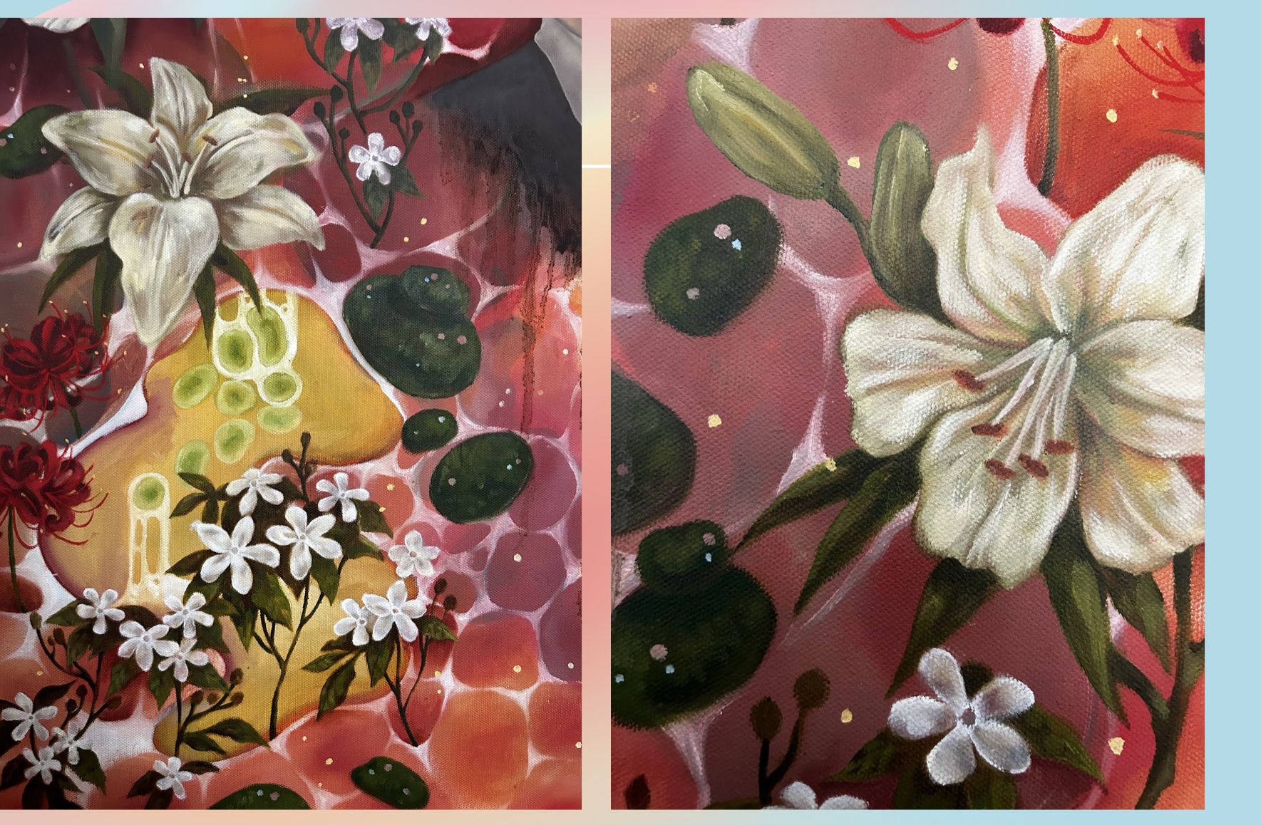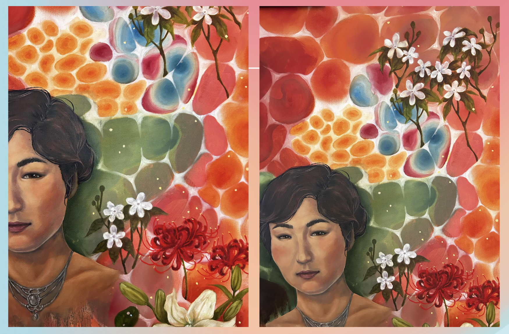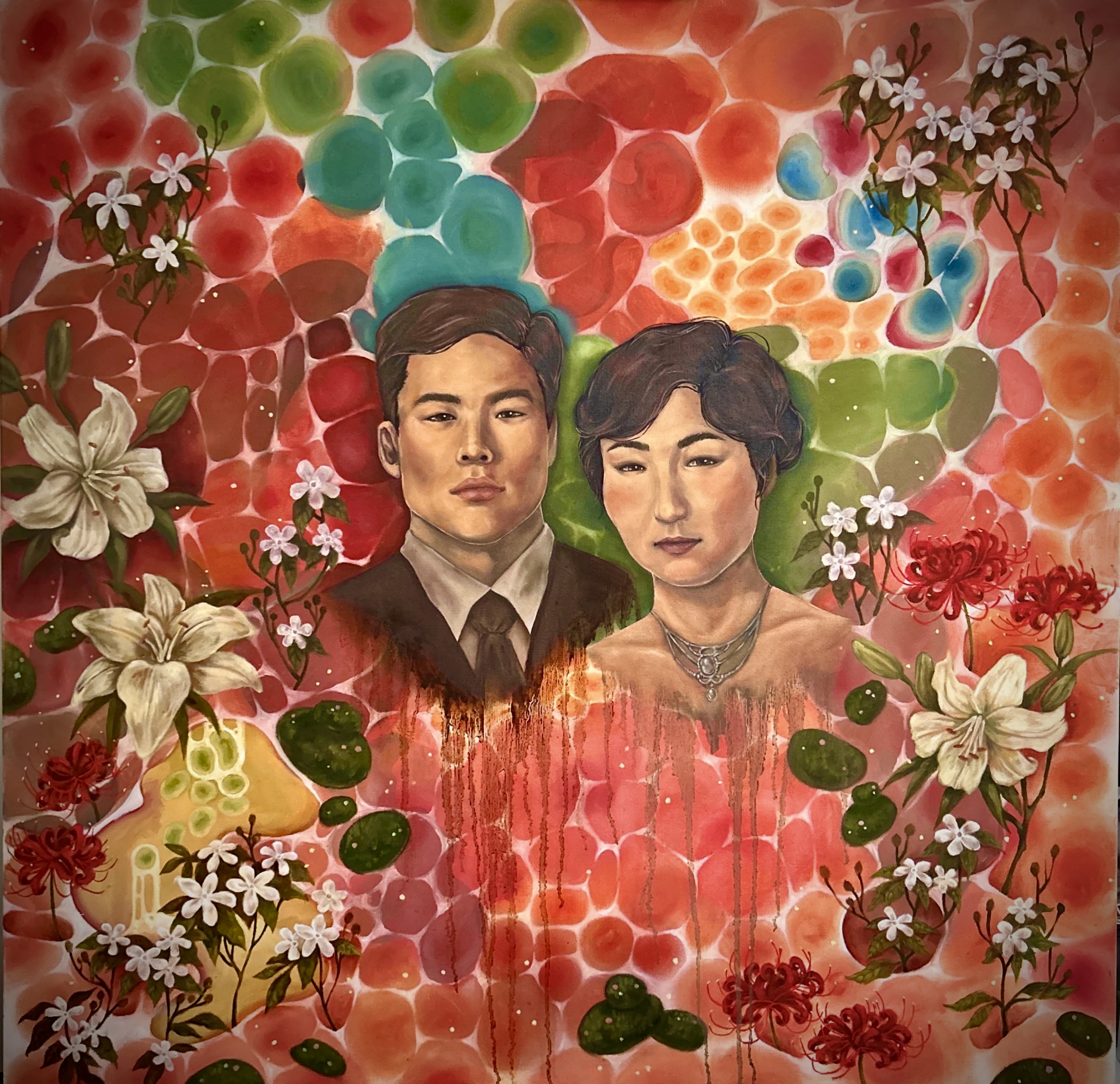 At the heart of the piece, the imagery of my grandparents stands as an homage to my roots. Surrounding them, I layered cellular and floral forms to reflect the evolution of time within the body, mind, and world. Cells—constantly regenerating, dying, and renewing—mirror the cycles of life that sustain us. Flowers, too, must wilt past their prime so that new growth may emerge. Together, these motifs speak to the inevitability of change and the quiet, overlooked beauty within life’s transient processes.