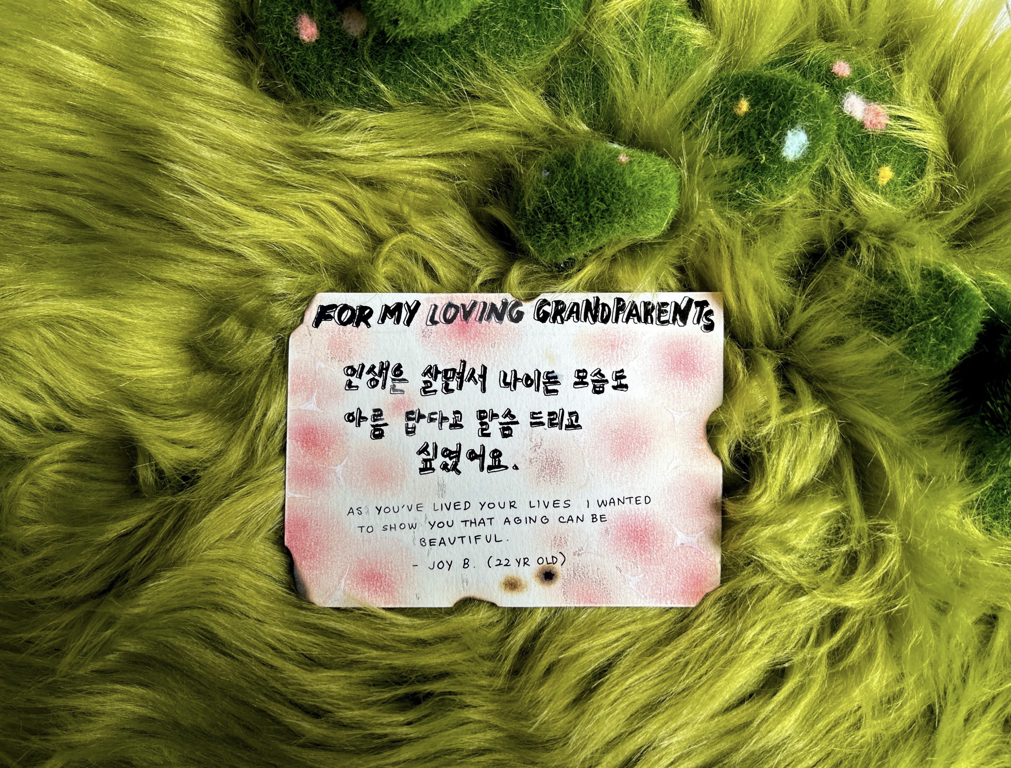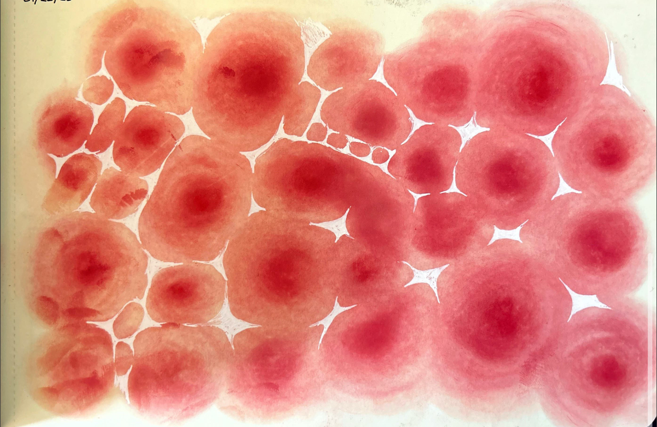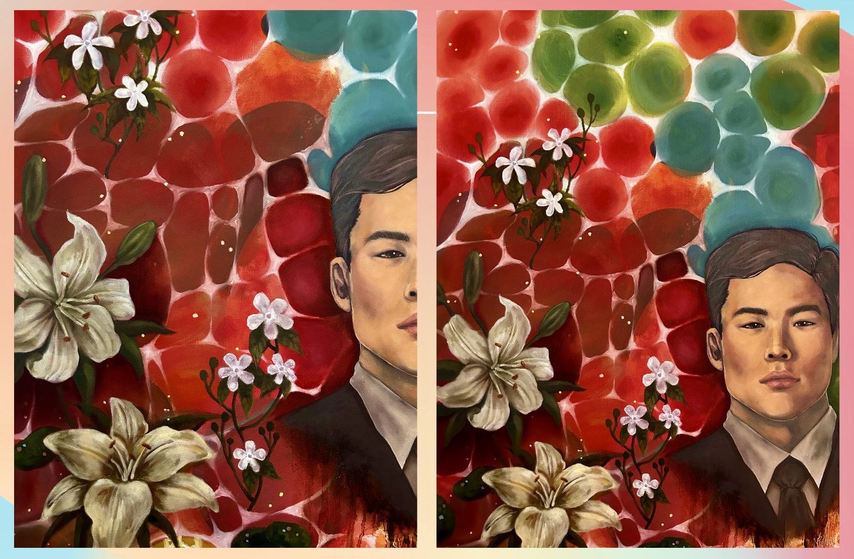 At the heart of the piece, the imagery of my grandparents stands as an homage to my roots. Surrounding them, I layered cellular and floral forms to reflect the evolution of time within the body, mind, and world. Cells—constantly regenerating, dying, and renewing—mirror the cycles of life that sustain us. Flowers, too, must wilt past their prime so that new growth may emerge. Together, these motifs speak to the inevitability of change and the quiet, overlooked beauty within life’s transient processes.